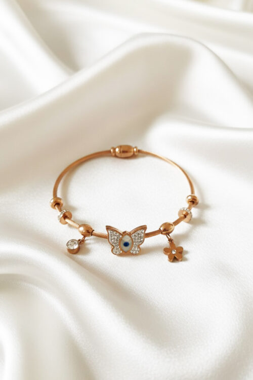 Whimsical Rose Gold Cable Bangle with Crystal Butterfly & Evil Eye
