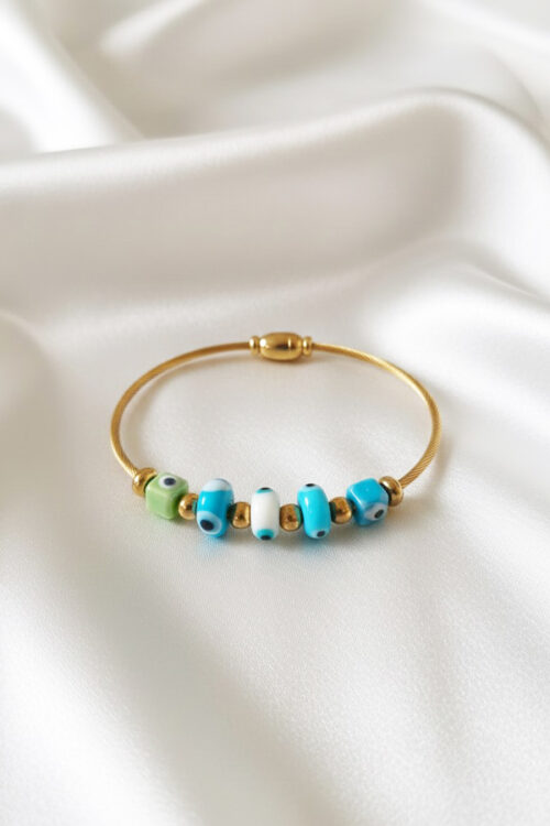 Chic Gold Cable Bangle with Multi-Colored Glass Evil Eye Beads