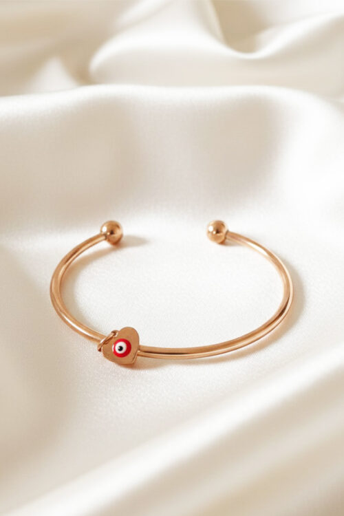 Minimalist Rose Gold Open Cuff Bangle with Red Heart Evil Eye Charm