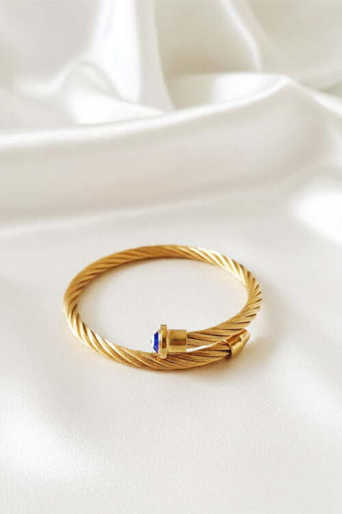 Elegant Gold Twisted Cable Cuff Bangle with Blue Evil Eye Accent