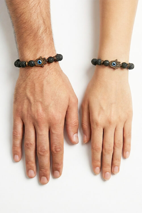 Unisex Black Lava Stone Bracelet with Hamsa Hand Evil Eye Charm