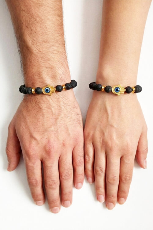 Unisex Black Lava Stone Bracelet with Gold Hamsa Evil Eye Charm