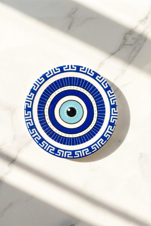 Artistic Ceramic Square Evil Eye Coaster with Greek Key Border