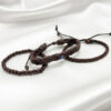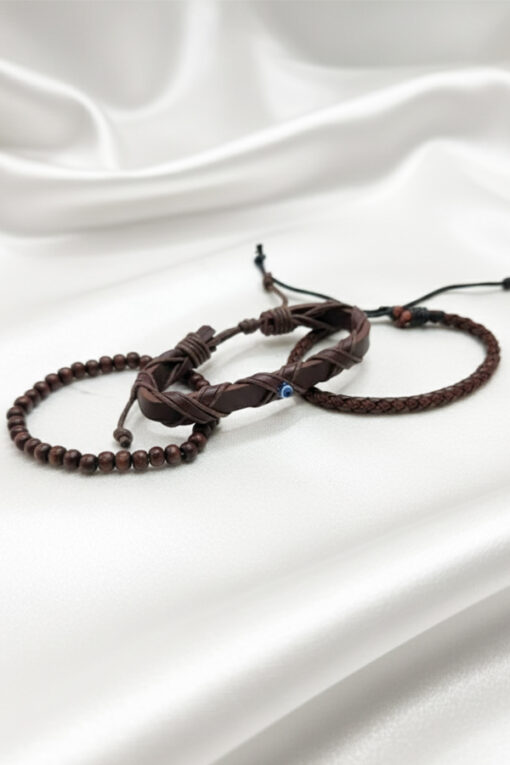 Grounded in earth tones and rugged craftsmanship, this 3-Piece Men’s Bracelet Set is the ultimate accessory for the modern man who values understated style. This curated stack features three distinct wristbands that play with texture and natural materials to create a cohesive, bohemian look. The set includes: Earth Element: A strand of smooth, dark brown wooden beads, adding a natural, organic touch that pairs perfectly with casual wear. Artisan Craftsmanship: The centerpiece of the stack is a broad brown leather bracelet featuring an intricate, knotted braid design that highlights durability and rugged elegance. Subtle Protection: Completing the trio is a minimalist woven cord bracelet holding a single Blue Evil Eye bead, a discreet talisman believed to ward off negative energy and “Nazar”. Each bracelet is finished with practical adjustable sliding knots, ensuring a secure and comfortable fit for any wrist size. Wear them stacked together for a bold statement or separate them to suit your mood—this versatile set is a stylish essential for everyday wear.