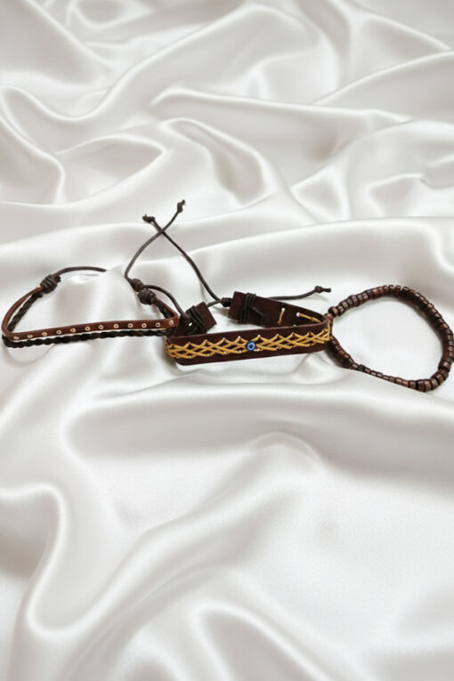 Master the art of effortless layering with this curated 3-Piece Men’s Bracelet Set. Designed for the adventurer at heart, this trio combines earthy textures with symbolic protection, offering a complete, rugged look right out of the box. The set includes three distinct styles that complement each other perfectly: The Centerpiece: A flat brown leather band featuring intricate yellow crisscross stitching. At its heart lies a small Blue Evil Eye bead, a traditional talisman for warding off negative energy. The Accent: A slender braided dark leather/cord bracelet detailed with small metallic studs, adding a subtle industrial edge to the stack. The Texture: A classic strand of dark brown wooden beads, providing a natural, grounded finish that ties the whole look together. Wear them all together for a bold statement or mix and match them individually to suit your mood. This stack is the ultimate accessory for casual, boho, or festival styles.