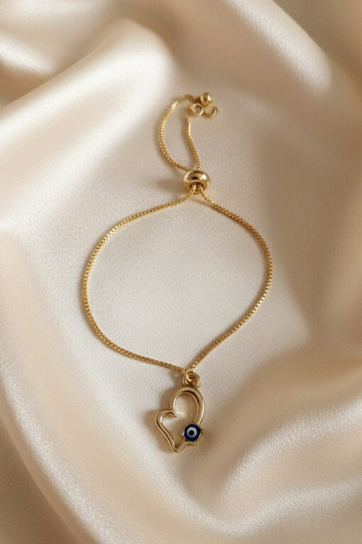 Delicate Gold Adjustable Slider Bracelet with Heart Evil Eye Charm