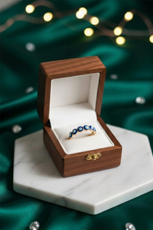 Designed with multiple blue evil eye motifs around the band, it symbolizes good luck, safety, and positive energy.