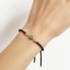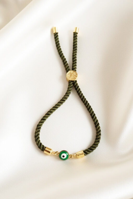 Connect with the grounding energy of nature while keeping negative vibes at bay with this Olive Green Cord Evil Eye Bracelet. This accessory features a high-quality twisted cord in a deep forest green shade, a color symbolizing growth, harmony, and renewal, making it a refreshing alternative to standard jewelry tones. It features a glossy green enamel border encased in a radiant gold-toned setting, with the classic protective eye motif at the center. This minimalist design offers a subtle yet effective way to carry the “Nazar” protection with you. Designed for all-day comfort, the bracelet is equipped with a user-friendly adjustable sliding clasp (bolo style), beautifully detailed with an embossed tree/leaf design to complement the earthy theme. This mechanism ensures a secure, custom fit for any wrist size. Finished with polished gold-toned end caps, this bracelet looks effortless when worn alone or adds a touch of organic style when stacked with gold or leather accessories.