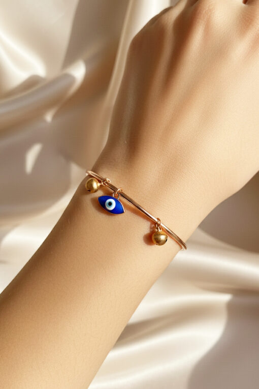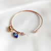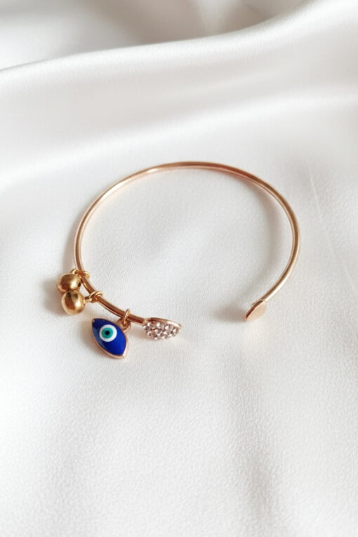 Add a warm, elegant glow to your jewelry collection with this sophisticated Rose Gold-Toned Evil Eye Bangle. Perfectly balancing modern minimalism with traditional charm, this bracelet features a sleek, lightweight open-cuff wire design. The flexible band is finished with a polished flat cap on one end, allowing for an easy, adjustable fit that suits various wrist sizes. The bangle is adorned with a cluster of meaningful and stylish charms that slide along the band. A classic Marquise-shaped Blue Evil Eye serves as a protective talisman, believed to ward off negative vibes. Adding a touch of luxury is a sparkling crystal-studded teardrop charm, which catches the light beautifully. Whether paired with ethnic wear or styled with a chic western outfit, this bangle is a versatile accessory. It stands out on its own or looks stunning when stacked with a watch, making it a perfect gift for yourself or a loved one.