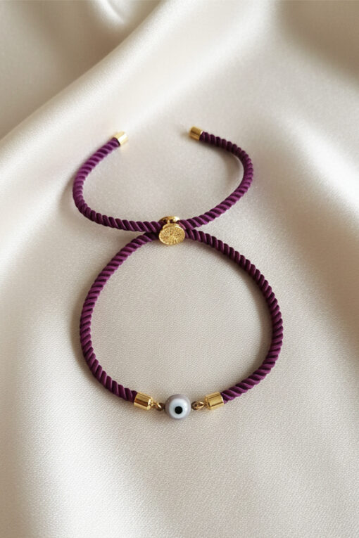 Channel intuition and spiritual elegance with this captivating Purple Evil Eye Adjustable Bracelet. The accessory is defined by its rich violet twisted rope band, a color historically linked to royalty, mystery, and creativity, making it a sophisticated addition to any outfit. This translucent, light purple talisman is minimalist yet powerful, believed to provide protection while enhancing inner peace and imagination. It is framed by two sleek gold-toned tubular spacers that add a refined, metallic shine to the piece. Designed for both style and convenience, the bracelet features the collection’s signature gold-toned sliding clasp with an engraved leaf detail. This mechanism ensures a fully adjustable, comfortable fit for any wrist size. Finished with polished gold end caps, this bracelet is a perfect subtle statement for those who love a pop of color with a touch of magic.