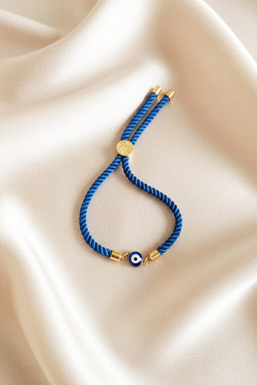 Adjustable Blue Cord Bracelet with Crystal-Studded Evil Eye Disc Charm
