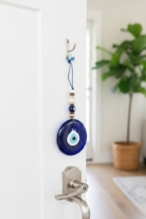The centerpiece is a substantial, polished deep blue glass Evil Eye medallion (Nazar), the globally recognized talisman used to ward off negative energy and the “evil eye” curse. The medallion is suspended by a delicate blue cord, beautifully accented with a vertical stack of various bohemian beads, including white, natural wood, and small patterned Evil Eye beads. This blend of materials gives the piece a charming, handcrafted aesthetic. The top loop allows for easy display near an entrance, window, or in any room. This deeply meaningful item serves as both a stylish decorative accent and a potent talisman, making it an ideal gift for housewarmings, new ventures, or anyone seeking continuous luck and security.