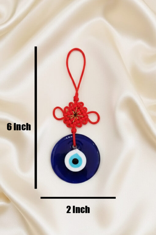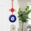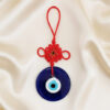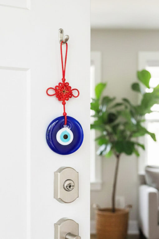 Bring vibrant luck and powerful protection to your space with this unique Evil Eye hanging. The centerpiece is a classic, polished deep blue glass Evil Eye medallion (Nazar), the globally recognized talisman used to ward off negative energy and attract good fortune. The medallion is suspended by an intricate red cord knot, which beautifully symbolizes good fortune, prosperity, and an unbroken bond in various Eastern traditions. The bright red and deep blue contrast makes this a striking decorative accent. It is perfect for hanging in an entryway, office, or car, making it an ideal gift for housewarmings, business openings, or anyone seeking to blend cultural meaning with lasting security.