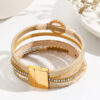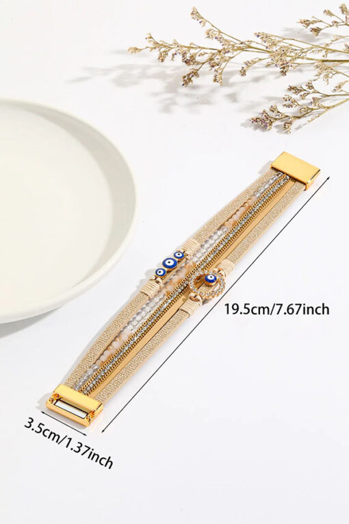 Achieve the perfect “wrist stack” look in seconds with this sophisticated Champagne Multi-Strand Evil Eye Bracelet. Designed for the fashion-forward individual who loves the layered aesthetic without the hassle of untangling multiple chains, this single piece combines five distinct textures into one cohesive, stylish cuff. The bracelet features a harmonious mix of beige bands, a shimmering mesh strip, a sparkling crystal cup chain, and a strand of faceted neutral beads. The focal point is a dazzling crystal-encrusted circle charm housing a protective blue Evil Eye, complemented by a second accent on a lower strand featuring a trio of smaller Evil Eye beads for double the symbolic protection. This easy-to-use closure ensures the bracelet stays securely on your wrist while making it effortless to snap on and off single-handedly.