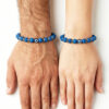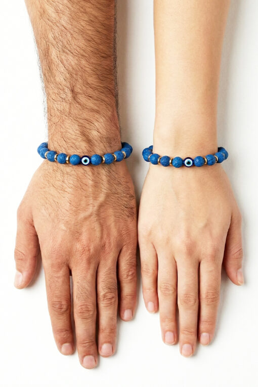 Infuse your style with vibrant color and spiritual defense using this Blue Lava Stone Evil Eye Bracelet. A stunning twist on traditional protection jewelry, this piece combines the grounding texture of volcanic rock with the calming hues of the ocean and sky. The bracelet features porous blue-dyed lava beads, which retain the stone’s natural ability to absorb and diffuse essential oils, allowing you to carry a soothing scent throughout the day. Interspersed between the stones are elegant gold-tone spacers, adding a touch of warmth and luxury that contrasts beautifully with the cool blue tones. At the center sits the classic Evil Eye talisman, a historic symbol believed to shield the wearer from envy and negative vibes. As shown in the image, it makes a perfect matching accessory for couples who wish to share a symbol of protection and harmony, or a standout individual piece for adding a pop of color to any outfit.