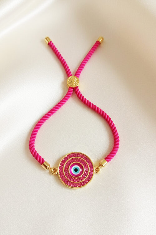Adjustable Hot Pink Cord Bracelet with Glittering Evil Eye Charm