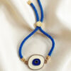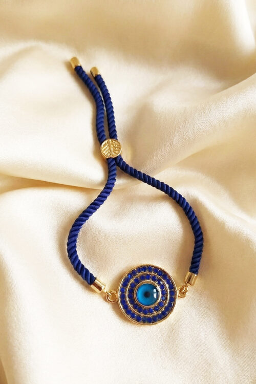 Adjustable Blue Cord Bracelet with Crystal-Studded Evil Eye Disc Charm