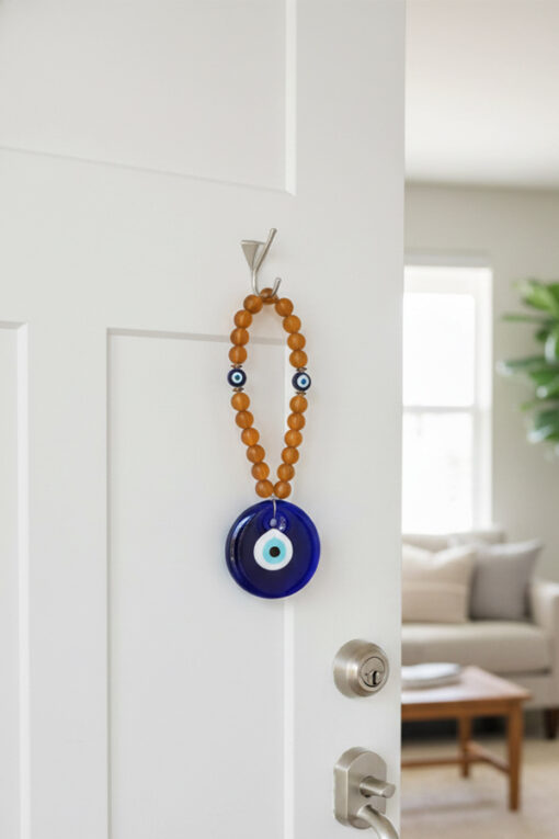 The centerpiece is a large, polished deep blue glass Evil Eye medallion, the globally recognized talisman revered for its power to ward off negative energy and attract good fortune. The medallion is suspended beneath a beautiful loop of matte amber-toned beads, giving the piece a warm, rustic, and bohemian aesthetic. The loop is accented with two intricately detailed smaller beads that feature the Evil Eye motif. This meaningful item serves as both a stylish decorative accent and a potent amulet. It is perfect for hanging near an entrance, on a wall, or in a car, making it an ideal, thoughtful gift for housewarmings or anyone seeking to infuse their environment with safety and unique charm.