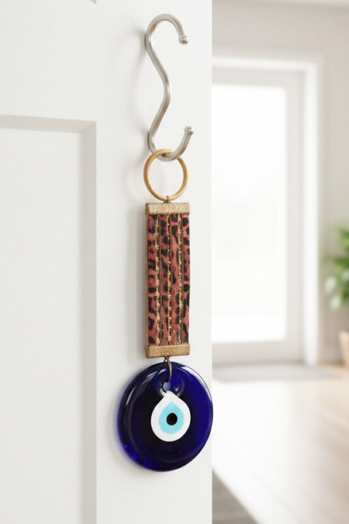The centerpiece is a substantial, polished deep blue glass Evil Eye medallion (Nazar), the globally recognized talisman used to ward off negative energy and attract good fortune. The charm is suspended by a decorative, rectangular accent featuring a trendy leopard print fabric overlaid with rustic gold threads, giving it a distinctive and rich bohemian aesthetic. The top is finished with a natural wood ring for easy hanging. This meaningful item serves as both a chic decorative accent and a potent talisman. It is perfect for adding a touch of wild elegance and security to your entryway, car, or living space, making it an ideal gift for housewarmings or fashion lovers.