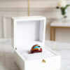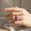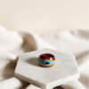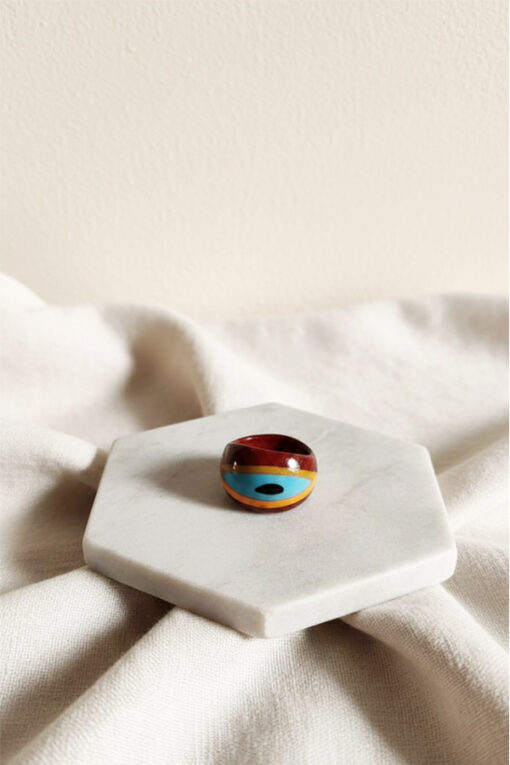 Introduce a splash of artistic color with this multi-layered resin ring. Featuring warm bands of burgundy, terracotta, and sunshine yellow, this piece beautifully contrasts with the vibrant blue evil eye detail. Displayed on a clean marble and fabric background, this accessory is the perfect statement piece for those who appreciate bohemian luxury and unique craftsmanship. It’s designed to effortlessly elevate both professional and casual wardrobes.