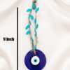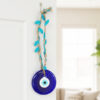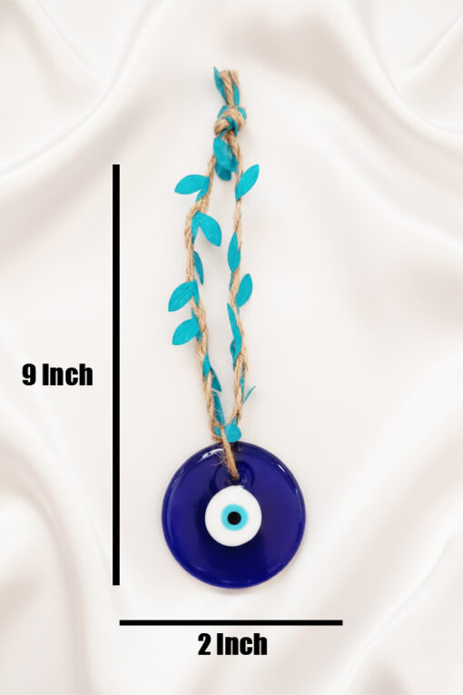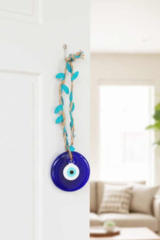 The centerpiece is a substantial, polished deep blue glass Evil Eye medallion (Nazar), the globally recognized talisman used to ward off negative energy and attract good fortune. The medallion is suspended by rustic jute twine, beautifully intertwined with delicate teal green leaves, creating a charming botanical and bohemian aesthetic. This blend of traditional symbolism with natural elements gives the piece a fresh, earthy feel. The top loop allows for easy display near an entrance, window, or in any room. This deeply meaningful item serves as both a stylish decorative accent and a potent talisman, making it an ideal gift for housewarmings, garden lovers, or anyone seeking continuous luck and a touch of nature’s beauty.