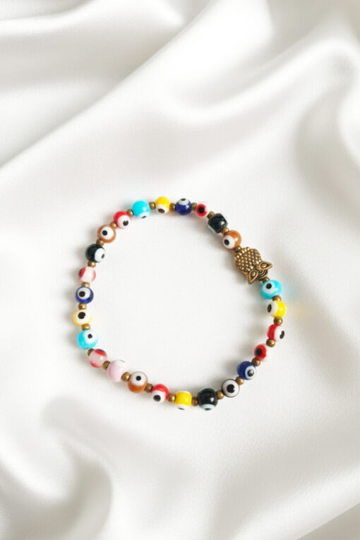 This lively accessory combines a playful spectrum of colors with vintage-inspired details to create a unique personal talisman. The bracelet features a strand of petite beads in a kaleidoscope of hues—including red, blue, yellow, pink, brown, and black—each bearing the watchful “Nazar” eye to deflection negative energy. In many traditions, the owl symbolizes wisdom, intuition, and the ability to see what others cannot, making it a perfect companion to the protective Evil Eye. This bracelet is the ultimate accessory for the free spirit. Its colorful palette represents holistic well-being—energy, calm, and joy—while the owl adds a layer of mystical insight.
