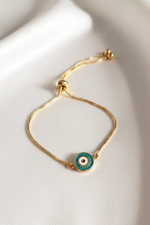 Delicate Gold Adjustable Slider Bracelet with Turquoise Heart Evil Eye