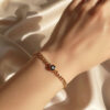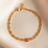 The bracelet is accented by a single, prominent Evil Eye charm set right into the chain.