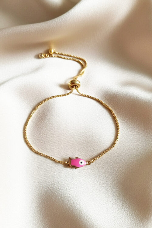 Delicate Gold Adjustable Slider Bracelet with Pink Enamel Fish Charm