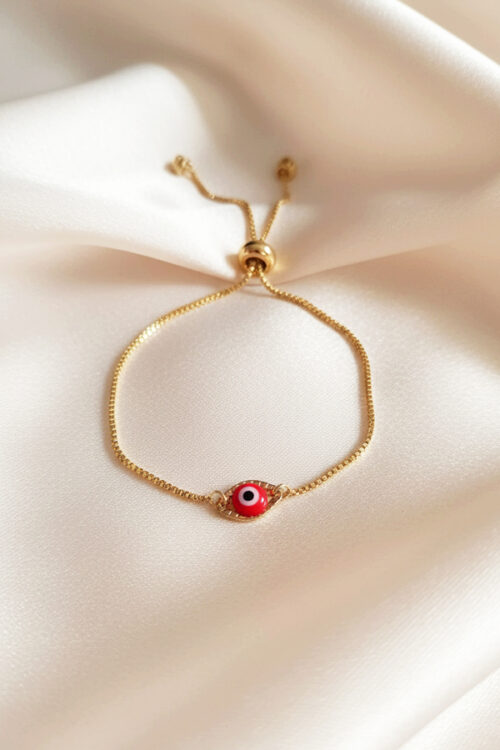 Delicate Gold Adjustable Slider Bracelet with Striking Red Evil Eye