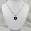 The circular pendant features a striking black enamel background that creates a bold contrast against the gold-tone chain.