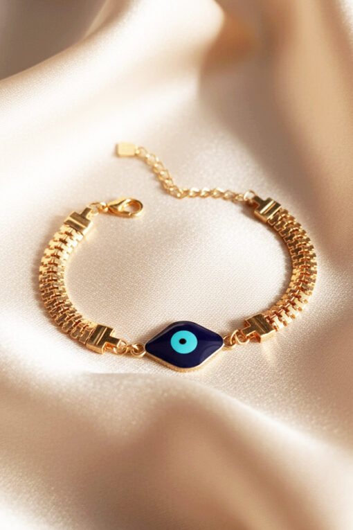 Bold Gold Textured Chain Bracelet with Navy Enamel Evil Eye