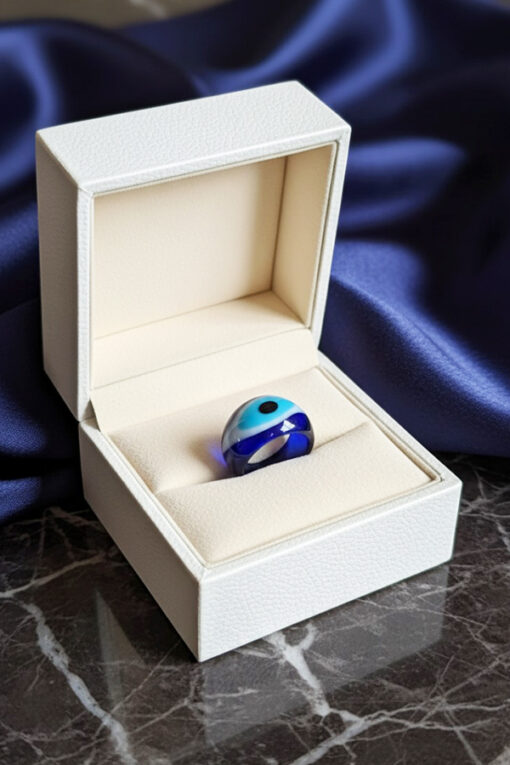Make a powerful style statement with this eye-catching resin ring. The band features deep navy and bright aqua blue tones, creating a vibrant contrast against the glossy finish. The central Evil Eye design is not only a trendy element but also symbolizes protection. Modeled beautifully to showcase its size and comfortable fit, this piece brings instant modern luxury to your hand.
