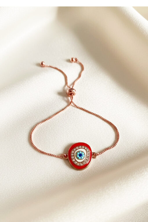The centerpiece is a bold, circular Evil Eye medallion encased in a dramatic ruby red enamel ring.