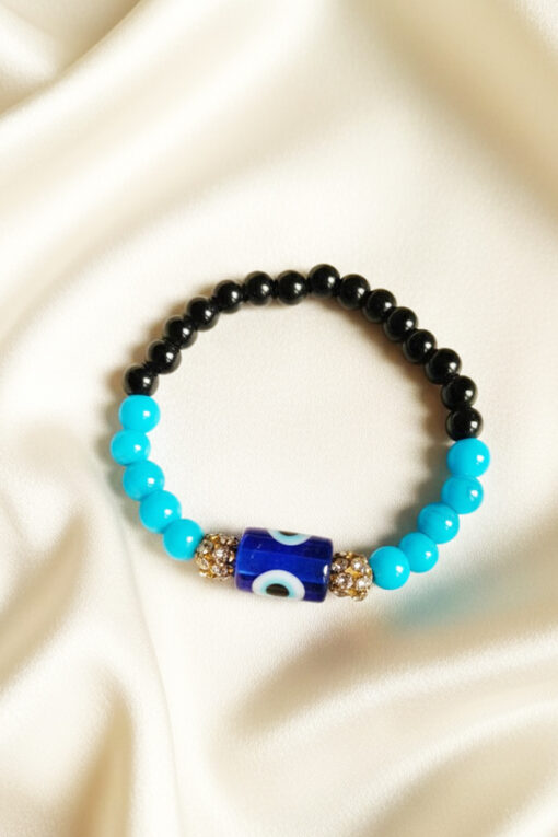 This modern accessory stands out with its dynamic color-block design, combining the grounding energy of darkness with the healing vibes of bright blue. The bracelet features a unique split composition: one half consists of sleek, glossy black round beads, while the other half pops with vibrant cyan-blue beads. At the heart of the piece lies a distinctive dark blue cylindrical (tube) bead hand-painted with the traditional “Nazar” eye motif to ward off negative energy. The central eye serves as the ultimate guardian. This bracelet is perfect for those who love high-contrast jewelry that tells a story.