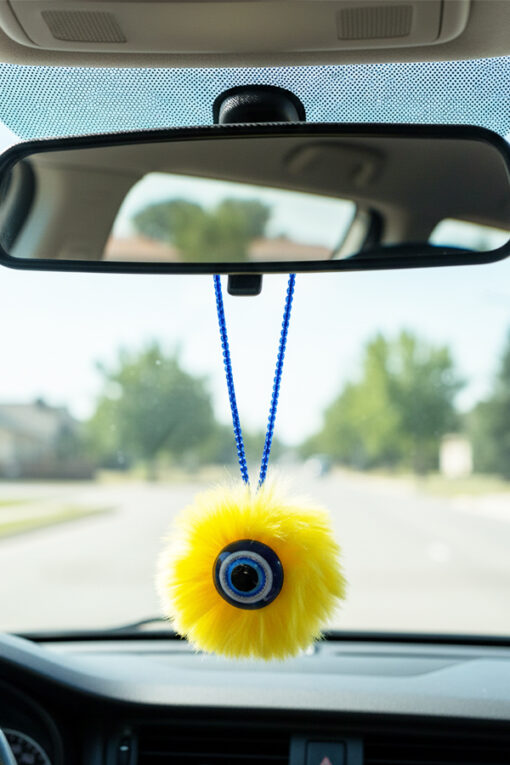 Bring sunny vibes and good fortune everywhere you go with this vibrant fur pom pom charm. The charm features a soft, fluffy bright yellow faux fur circle that immediately catches the eye, adding a cheerful, playful texture. Set brightly at the center of the pom pom is a classic blue and white glass Evil Eye bead, the globally recognized talisman used to ward off negative energy and bring good fortune. It hangs from a durable blue beaded cord, perfect for decorating backpacks, handbags, or hanging from a car mirror. This unique and delightful item makes an ideal and thoughtful gift, seamlessly blending trendy, plush style with powerful, meaningful protection for everyday cheer and security.
