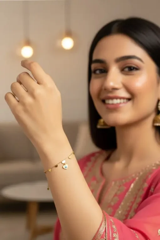 Adorn your wrist with this charming and durable Anti-Tarnish bracelet. Crafted in a luxurious gold tone that resists dulling, this delicate piece features a fine chain beautifully embellished with tiny dangling heart charms. This design beautifully blends symbols of love and affection (the hearts) with the powerful, traditional meaning of the Evil Eye, which symbolizes protection and good fortune. Its dainty yet eye-catching design makes it perfect for subtle, everyday elegance. With an adjustable clasp for a comfortable and secure fit, this lightweight bracelet is an ideal gift or a meaningful addition to any modern, feminine jewelry collection.