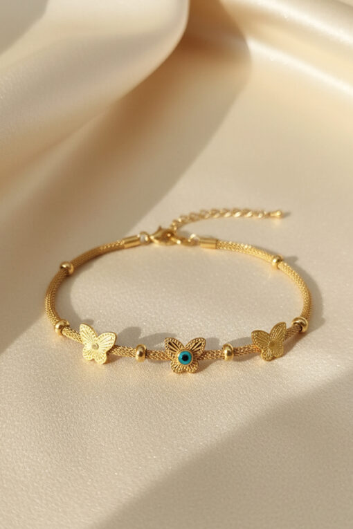 Adorn your wrist with this charming and sophisticated gold bracelet, featuring an anti-tarnish finish for enduring brilliance. The center design is adorned with three delicate butterfly charms: two beautifully textured gold butterflies flank a central butterfly, which features a subtle yet powerful blue Evil Eye motif. This combination symbolizes transformation, good luck, and protection against negative energy. Tiny gold beads separate the charms, adding beautiful detail and texture. With its adjustable fit and durable craftsmanship, this bracelet is perfect for those who appreciate accessories that are both meaningful and effortlessly elegant. It makes a wonderful gift for any nature or charm lover.