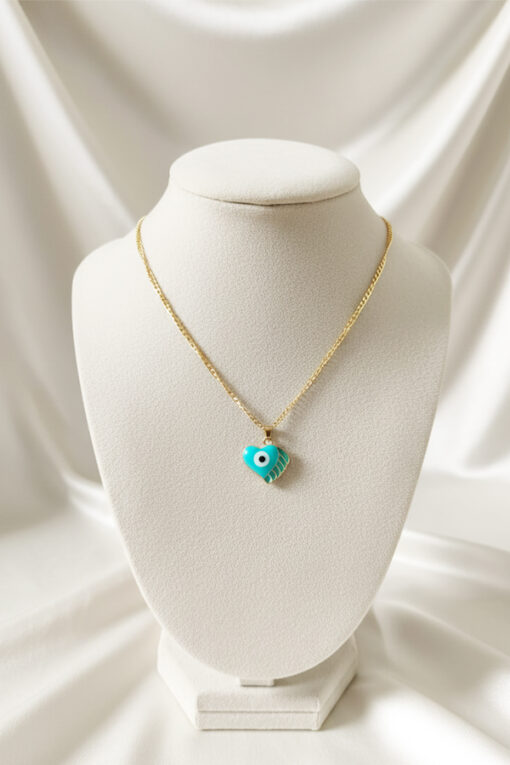 Adorn your neckline with this charming and meaningful gold necklace. The heart is beautifully rendered in a serene turquoise enamel, which subtly incorporates the protective Evil Eye motif. This combination of a loving symbol (the heart) and a lucky talisman (the Evil Eye) makes the necklace deeply significant and stylish. Its sweet yet sophisticated design makes it an ideal accessory for everyday wear or a thoughtful gift to express care and protection. The vibrant color and smooth enamel finish ensure this necklace is an eye-catching and cherished addition to any jewelry collection.