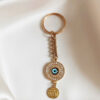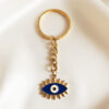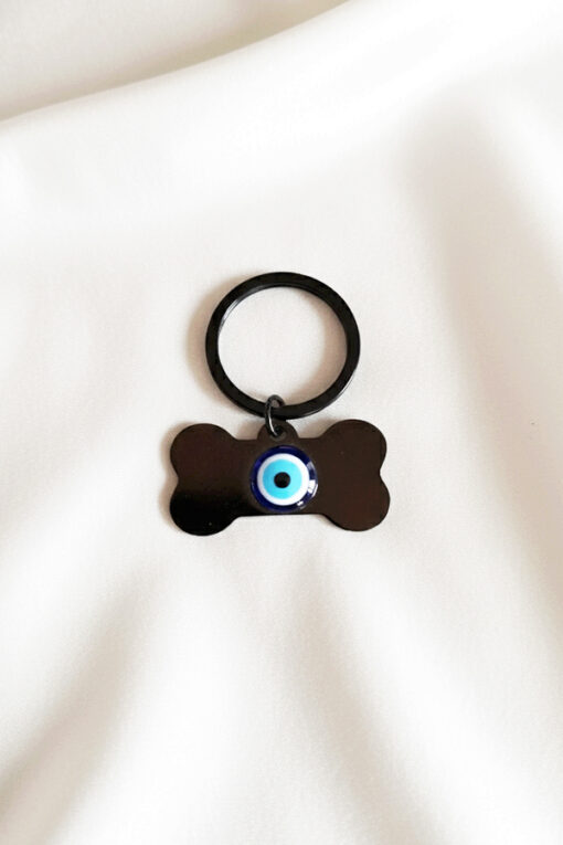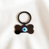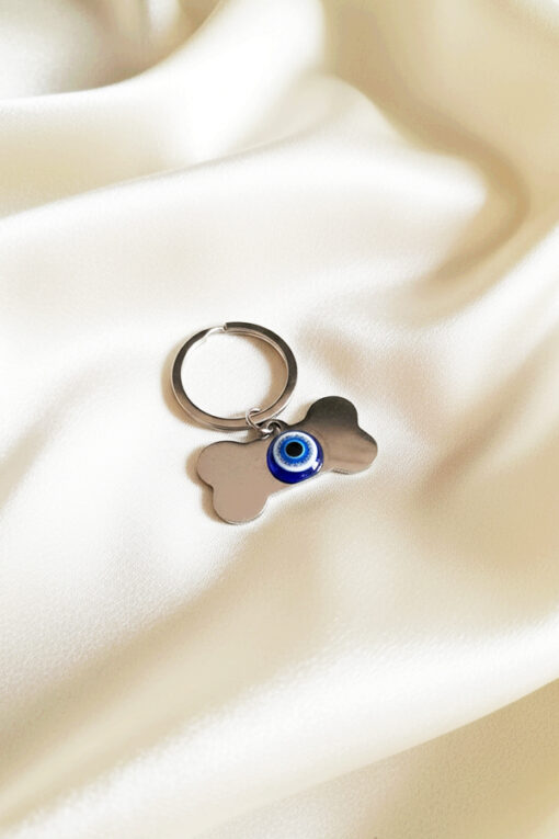 Carry a touch of love and protection with this delightful keychain, shaped like a classic dog bone or pet tag. Dangling playfully from the center of the bone charm is a small, traditional Evil Eye medallion with a vibrant blue iris.