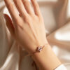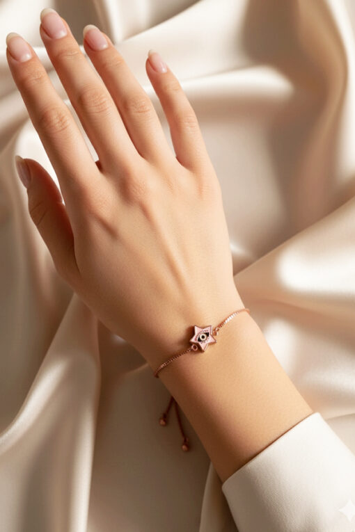 Shine brightly and stay protected with this exquisitely charming rose gold bracelet. The piece features a fine, elegant chain and a secure slider mechanism (or bolo clasp), allowing you to easily adjust the bracelet for a perfect, custom fit on any wrist size. The centerpiece is a delightful five-pointed star charm, a beautiful celestial symbol of guidance and luck. The star is vividly detailed with a soft pink and black Evil Eye motif, offering a unique, feminine twist on the traditional protective talisman. Its delicate aesthetic makes it ideal for subtle, everyday elegance or layering with other pieces. This durable, adjustable accessory is an essential piece for those who appreciate sophisticated, symbolic style and effortless wear.