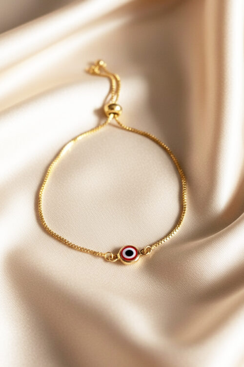 Charming Gold Adjustable Slider Bracelet with Red Evil Eye Fish Charm