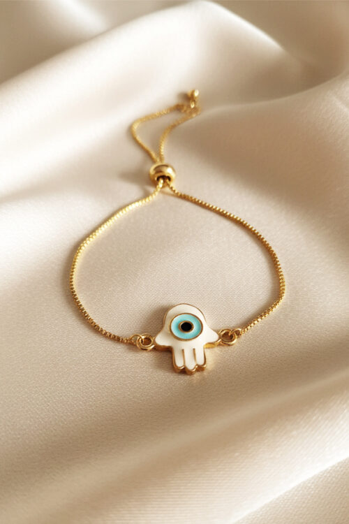Chic Adjustable Gold Bolo Bracelet with White Enamel Hamsa Hand Charm