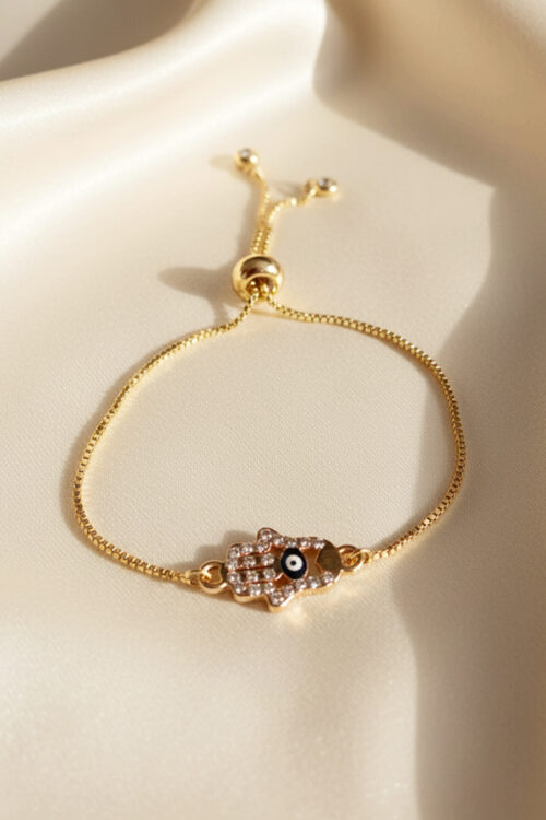 Dazzling Gold Adjustable Bolo Bracelet with Pave Hamsa & Evil Eye Charm