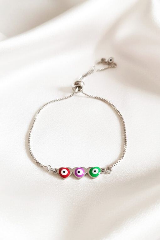 Adorn your wrist with this exquisite and perfectly adjustable silver bracelet. The piece features a fine, sleek chain and a secure slider mechanism (or bolo clasp), allowing you to easily adjust the bracelet for a comfortable, custom fit for any wrist size. Each heart contains a miniature Evil Eye motif, blending the symbolism of love, luck, and protection against negative energy. This charming accessory is a beautiful way to wear multiple protective talismans in one fun, colorful piece. Ideal for subtle, everyday elegance or layering with other bracelets, this durable, adjustable accessory is an essential, worry-free gift for yourself or a loved one.