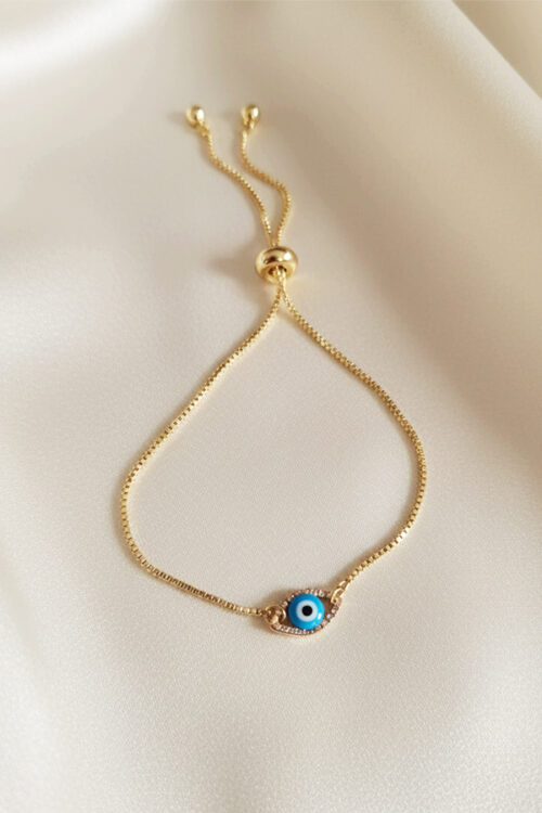Dainty Gold Adjustable Bolo Bracelet with Pave Evil Eye Charm