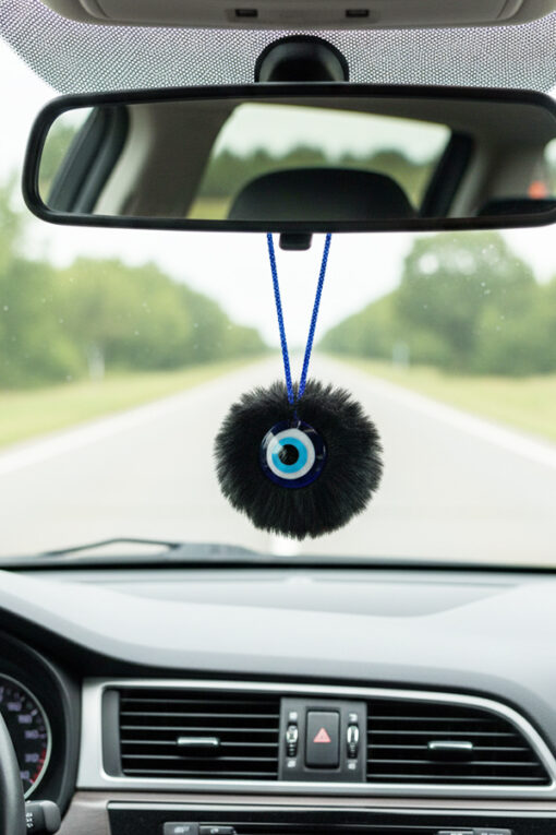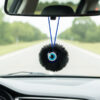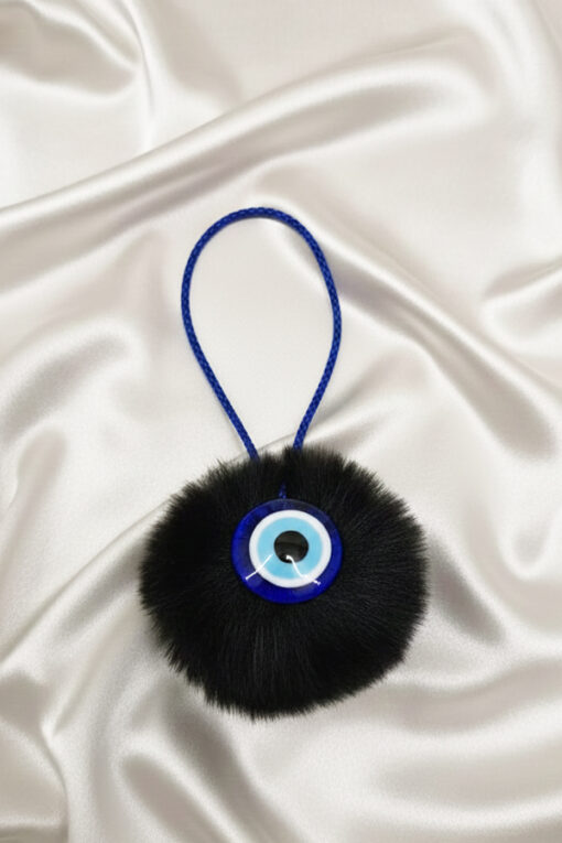 The centerpiece is a plush, round black faux fur pom pom, adding a sophisticated, tactile texture. Centered perfectly on the pom pom is a prominent glass Evil Eye medallion, featuring the classic concentric circles of deep blue and light blue. This iconic symbol is a globally recognized talisman used to ward off negative energy and bring good fortune. The charm hangs from a durable braided blue cord, allowing for easy display in your car, on your handbag, or attached to a backpack. This meaningful piece serves as both a chic decorative accent and a potent amulet, making it an ideal gift for housewarmings or anyone seeking to infuse their belongings with style and security.