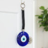 Bring modern style and powerful protection to your home or office with this elegant Evil Eye hanging. The centerpiece is a large, polished deep blue glass Evil Eye medallion (Nazar), the globally recognized talisman used to ward off negative energy and bring good fortune. The simple silver-toned keyring allows for easy display on hooks, doorknobs, or car mirrors. This meaningful item serves as both a stylish decorative accent and a potent talisman, designed to protect entrances and spaces. It makes an ideal gift for housewarmings, new businesses, or anyone seeking to infuse their environment with lasting luck and sophisticated security.