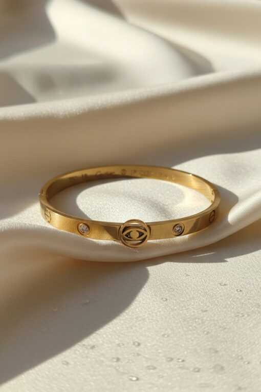 Define your wrist with this effortlessly chic gold bangle. This piece features a smooth, polished band detailed with subtle engraved accents and brilliant crystal inlays, giving it a touch of discreet luxury. The focal point is a central Evil Eye motif, a timeless symbol of protection and good fortune. Its elegant circular design adds meaningful depth to the classic style. The streamlined silhouette makes it a versatile piece that looks sophisticated whether worn alone or stacked with other bracelets. Crafted for comfortable and secure everyday wear, this bangle is the perfect accessory to add a modern, high-fashion appeal to both your professional and evening attire. It’s an ideal gift that combines timeless design with powerful symbolism.