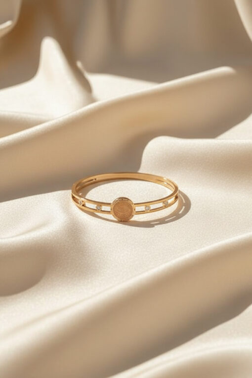 The sleek, polished band is open at the back for easy wear and features a central medallion charm with a beautifully detailed, engraved Evil Eye. This subtle, artistic interpretation of the protective symbol offers a refined touch. The bangle is further enhanced by delicate, bezel-set crystal accents spaced evenly across the top, adding a gentle shimmer. This design perfectly balances understated luxury with meaningful symbolism. It’s an essential accessory for those who appreciate high-quality jewelry with clean lines and subtle sparkle. Wear it alone for a minimalist statement or combine it with other bracelets for a personalized, layered look.